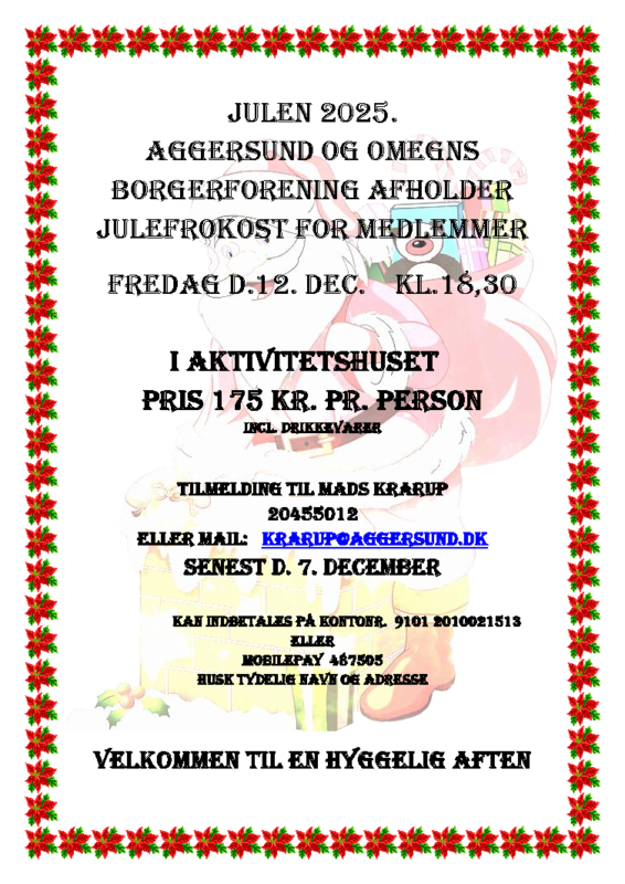 Nyheder Aggersund og Omegns Borgerforening afholder Julefrokost. Se mere her.. Udgivet den november 17, 2025 af Jens Røge 17 nov